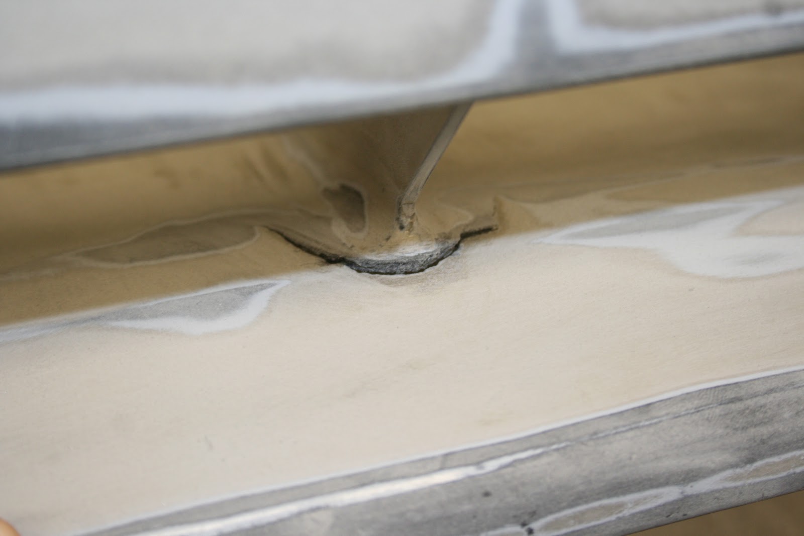 And a close up of the middle of the hood so you can get a better feel for what a 'sand-through" looks like. In retrospect, I shouldn't have gone this far, and should have fixed the high-spot a lot sooner. But I was scared to do too much hammering, hoping to get the panel flat before I actually got all the way down to bare metal. Don't do this, just hammer it out softly as soon as you see there is a high spot.